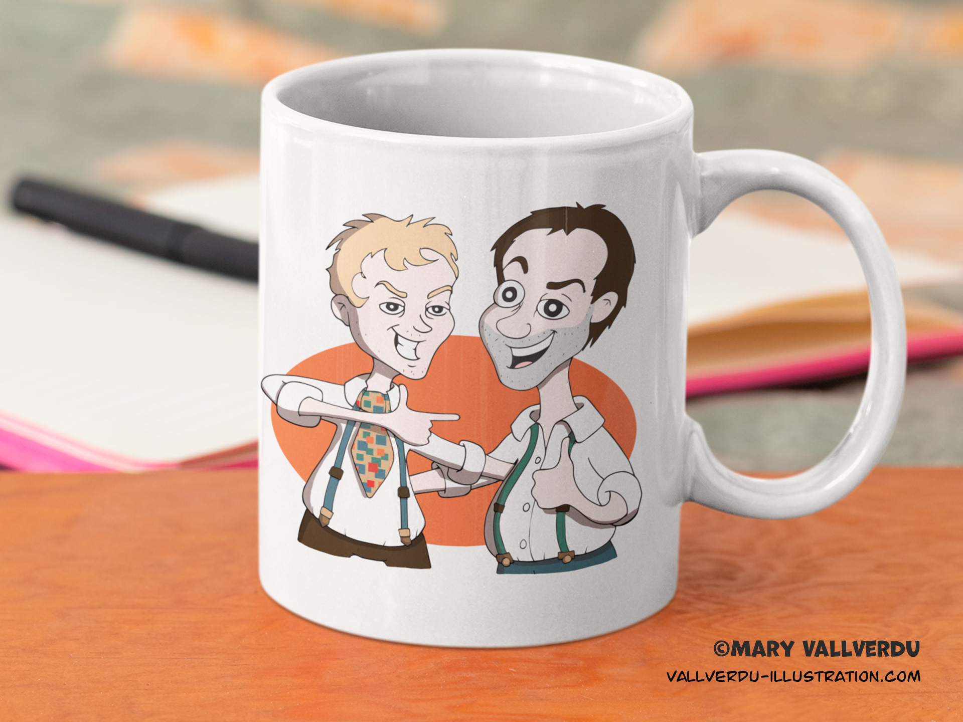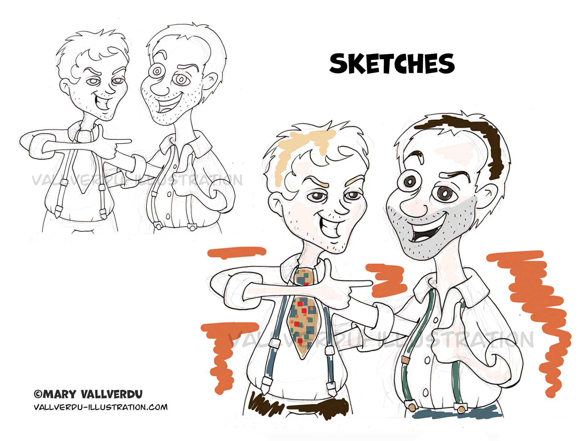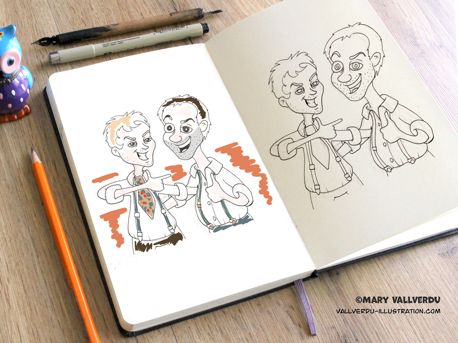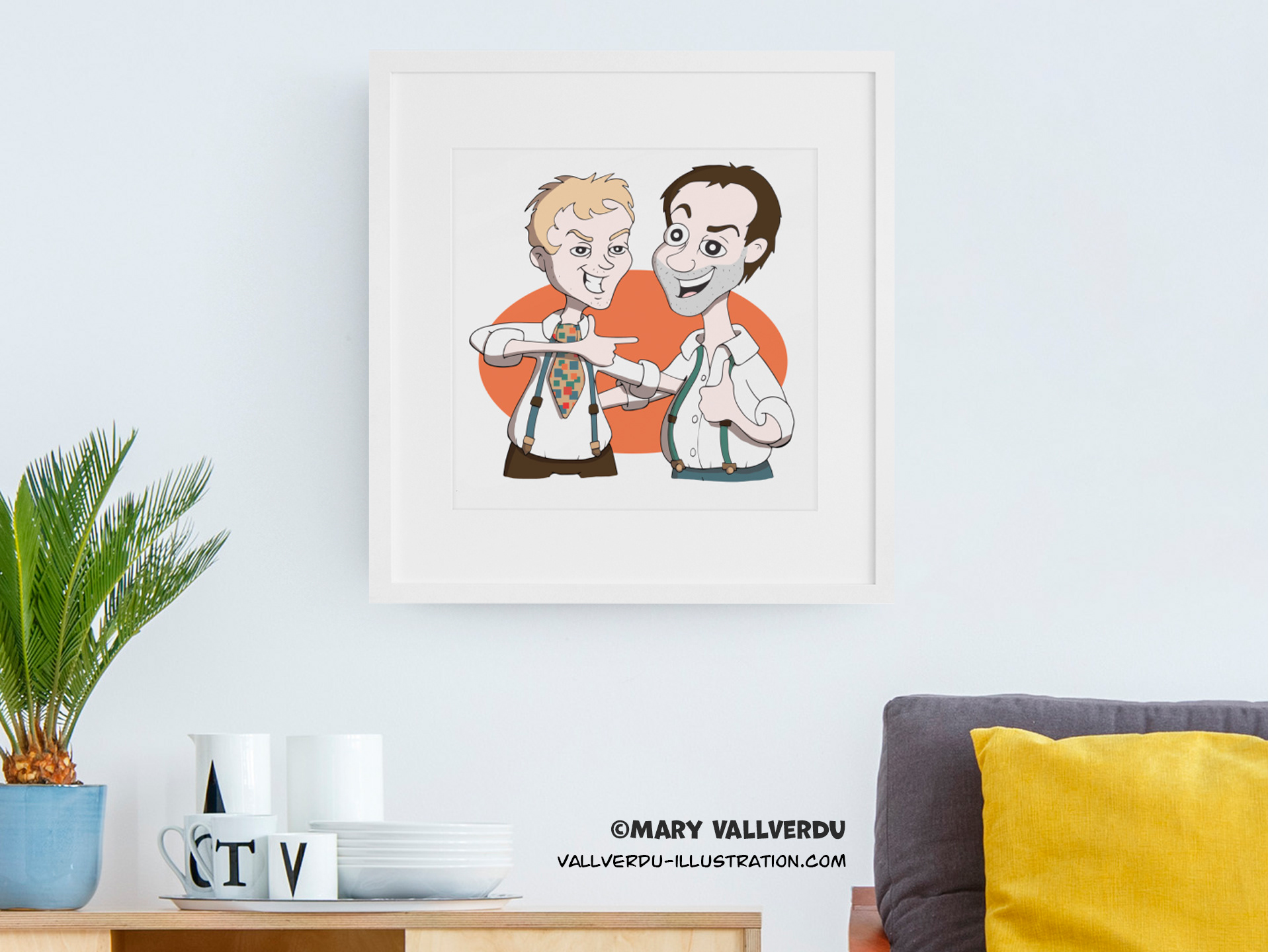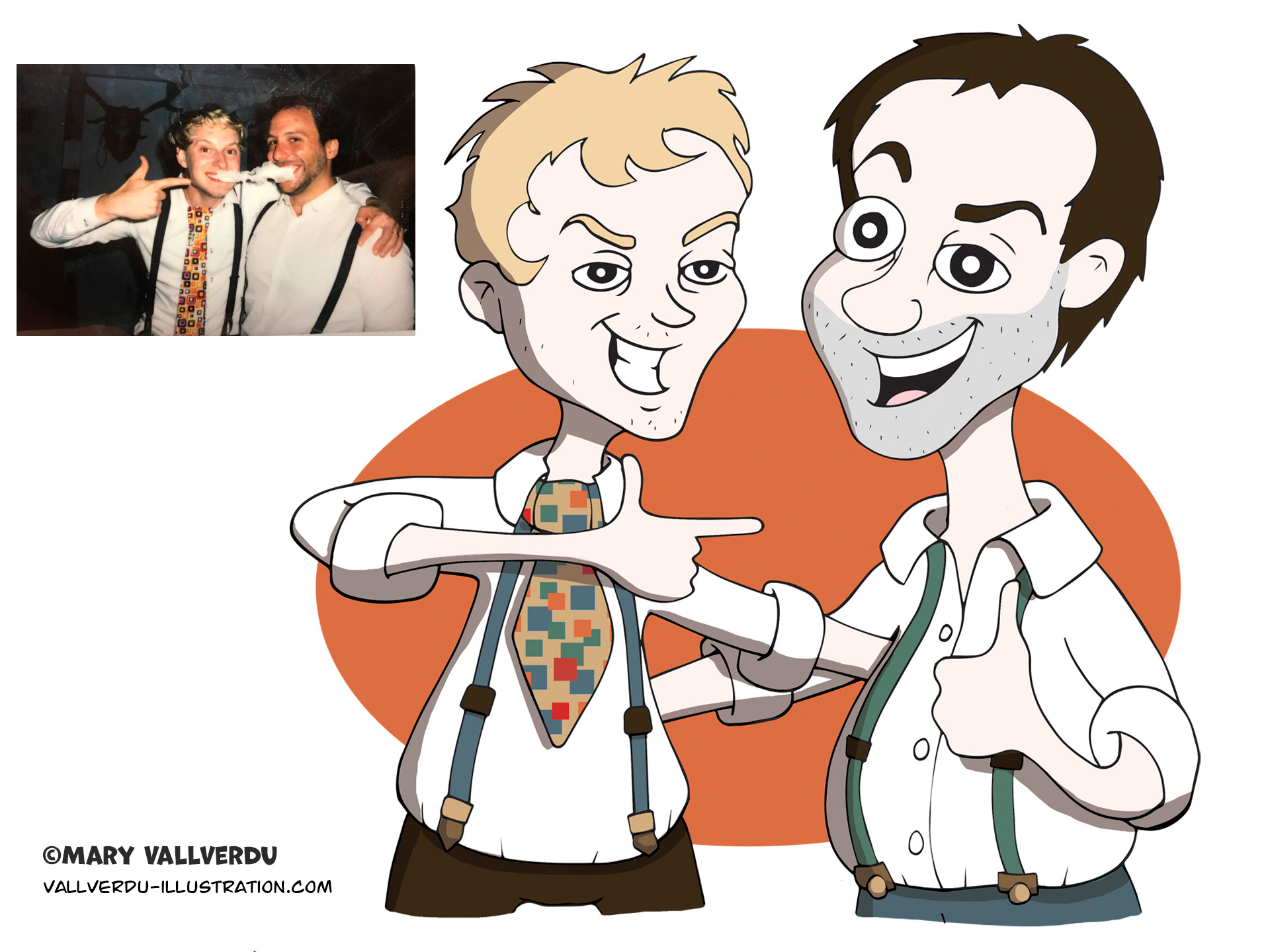 Commissioned illustration, cartoon style based on a photograph. Made to be printed on t-shirts and a birthday card.